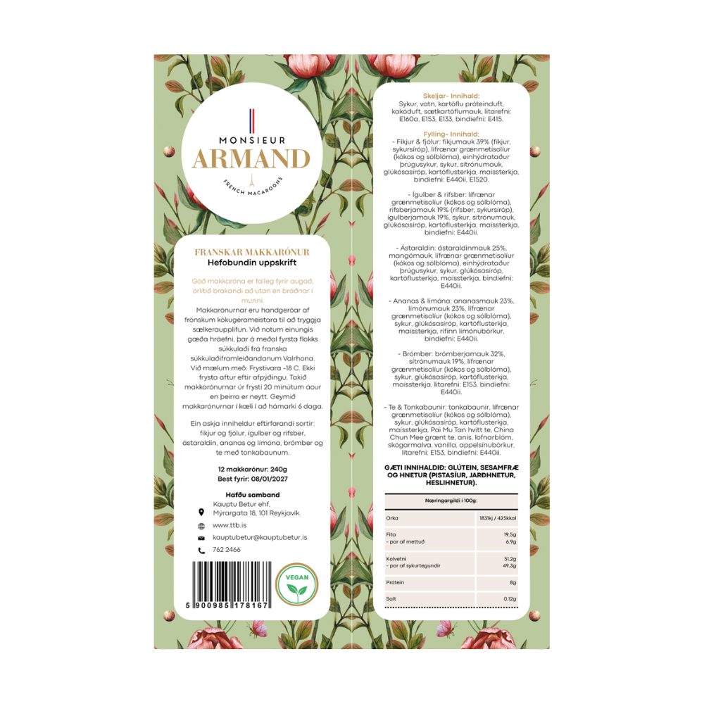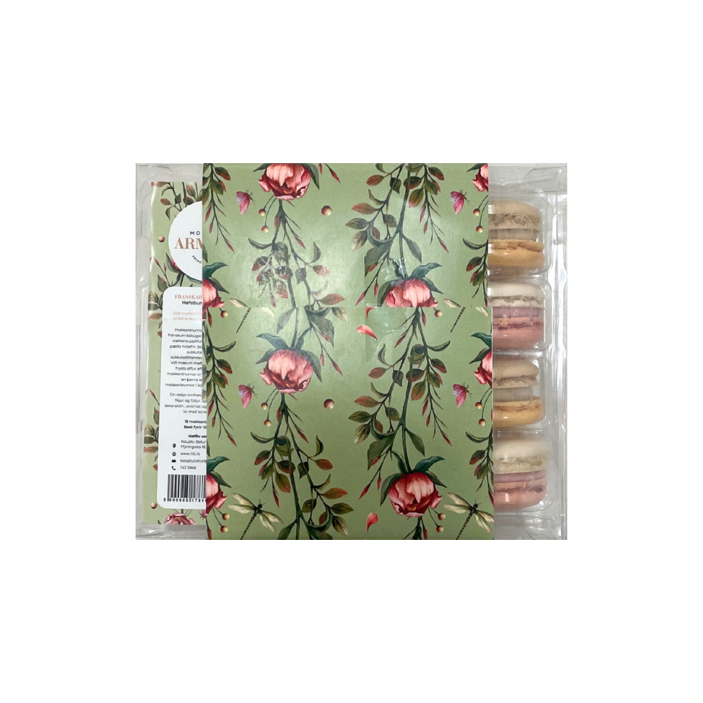 Try our new vegan, gluten and dairy free macarons! One box contains the following types: figs and violets, sea buckthorn and currants, passion fruit, pineapple and lemon, blackberry and tea with tonka bean.