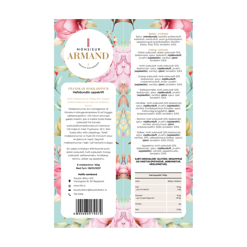 We recommend: Freezer -18 C. Do not refreeze after defrosting. Remove the macarons from the freezer 20 minutes before eating. Store the macarons in the refrigerator for a maximum of 6 days.